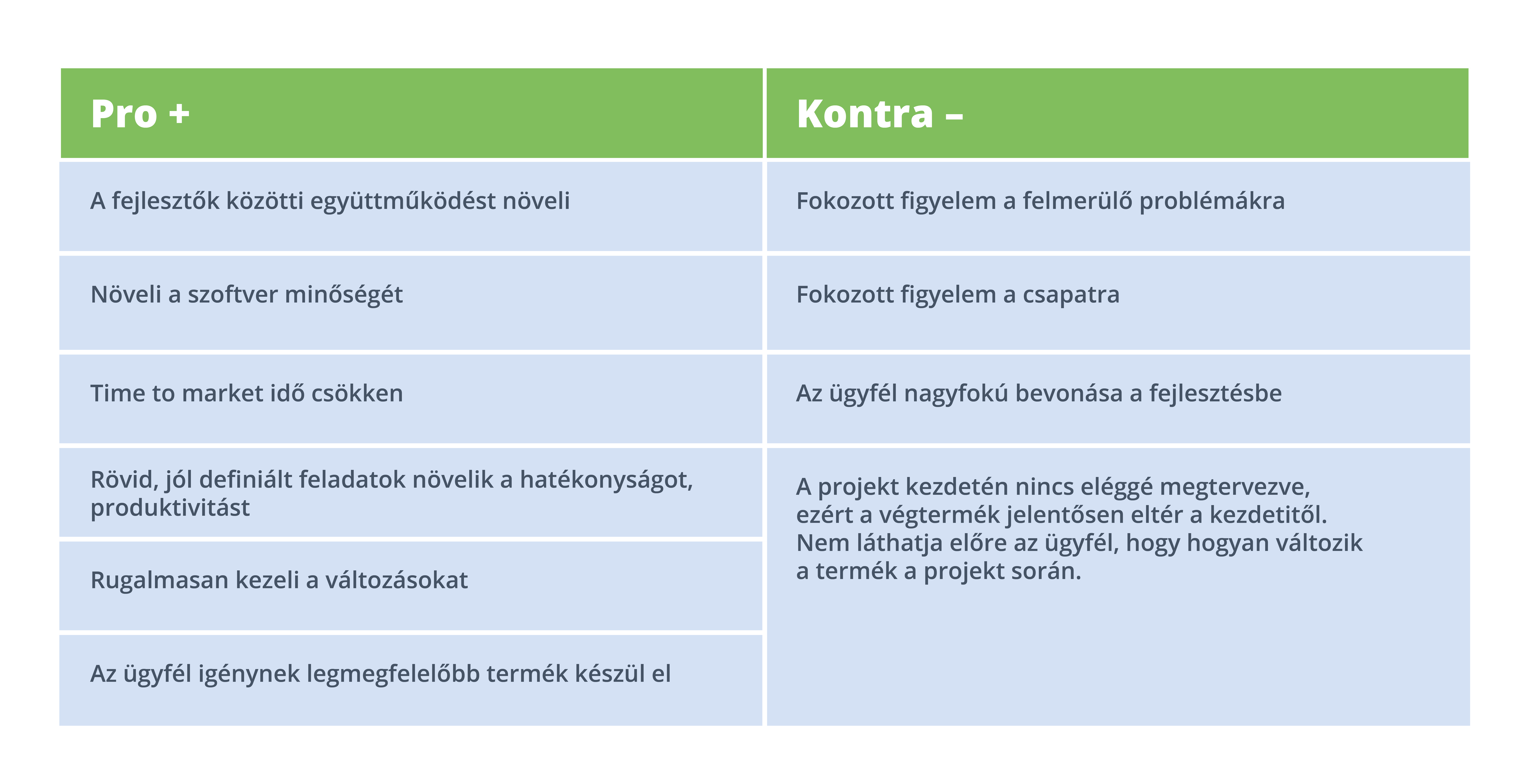 A következő táblázatban, az agilis modellhez hasonlóan összeszedtünk pár jellemző és fontos érvet/ellenérvet a vízesés modellhez is.